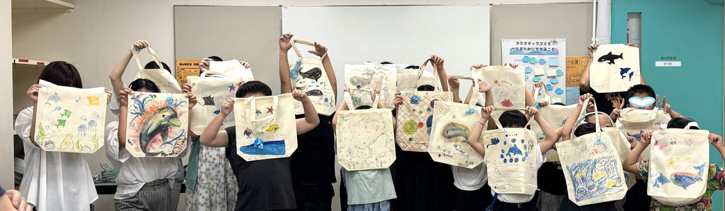 ワークショップの後半は、イルカやクジラ、魚など海の生きものをモチーフに、ペットボトルキャップをアップサイクルしたチャームを作り、エコバックに絵を描いてもらいました。楽しみながらアップサイクルの重要性、海の生態系を学びました。